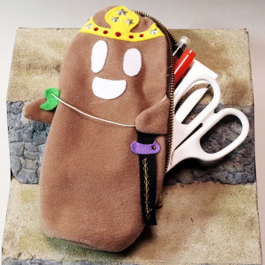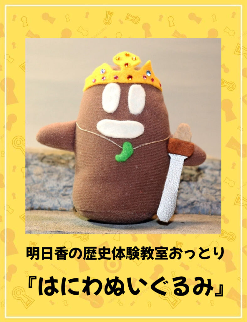 明日香の歴史体験教室おっとりのイメージキャラクター「はにっち」をぬいぐるみにしました。ファスナーを取り付けた小物入れやミニフィギュアも作りました。