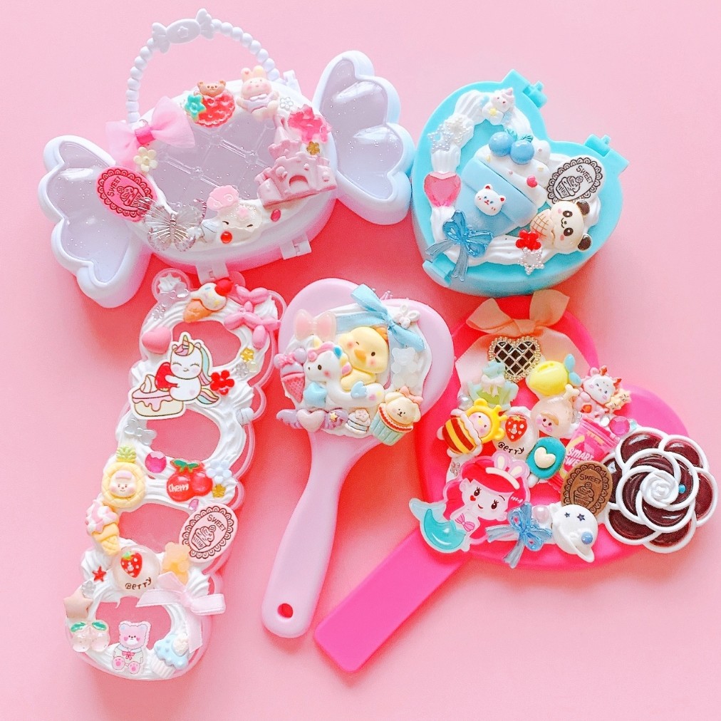 可愛いカラーのヘアブラシやアクセサリーケースにパティシエのお姉さんがホイップをしてくれ、自分で選んだ可愛いパーツをのせて世界で一つの自分だけのオシャレで可愛い雑貨を作るワークショップです。選べるパーツに加えたくさんの付け放題パーツのご用意もございます!