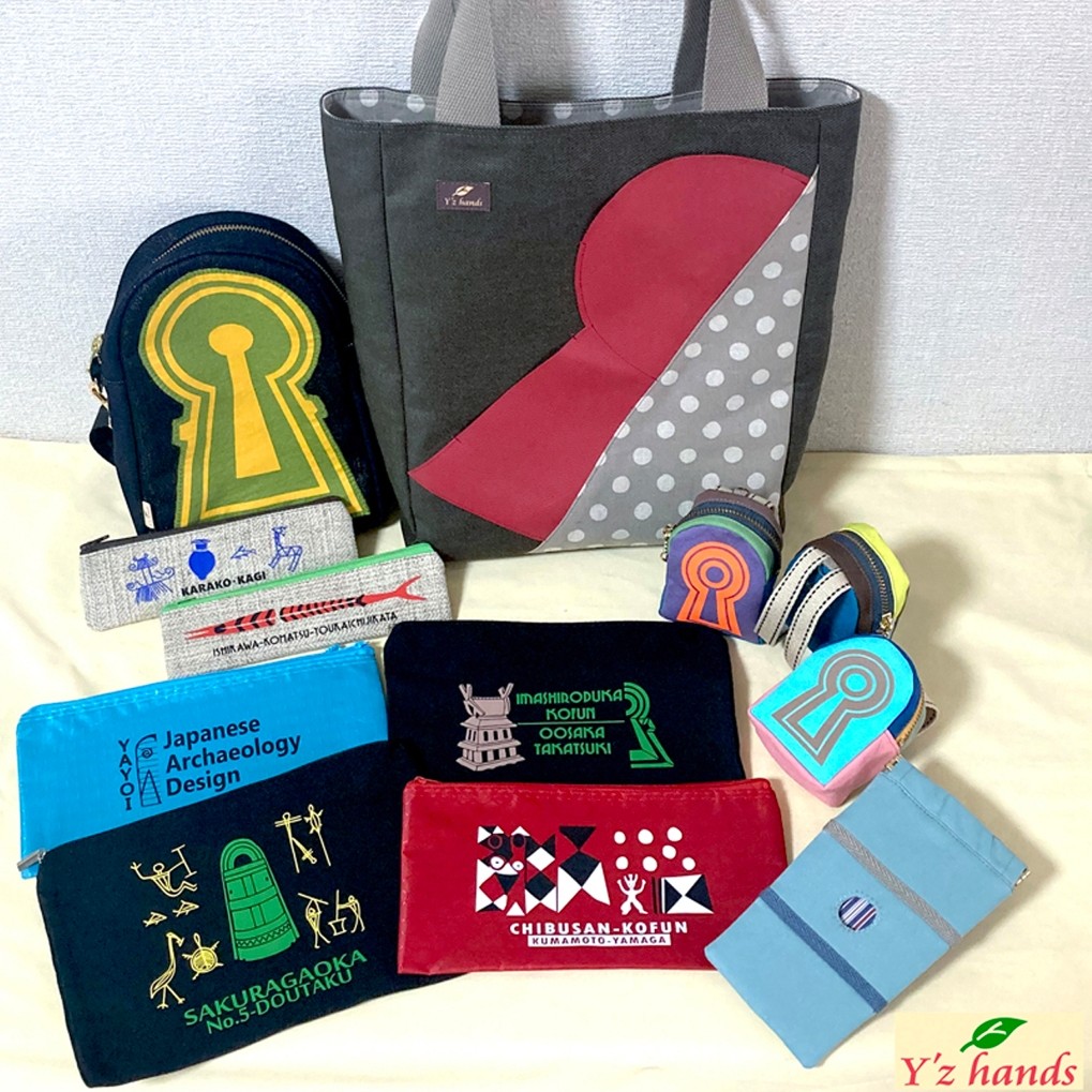 アイロンプリントや革などを使ってデザインし、バッグやポーチ・巾着などに仕立てました。デザインは写真や図面からトレースしたもので「リアル」な考古学の世界を作品に表現しています。