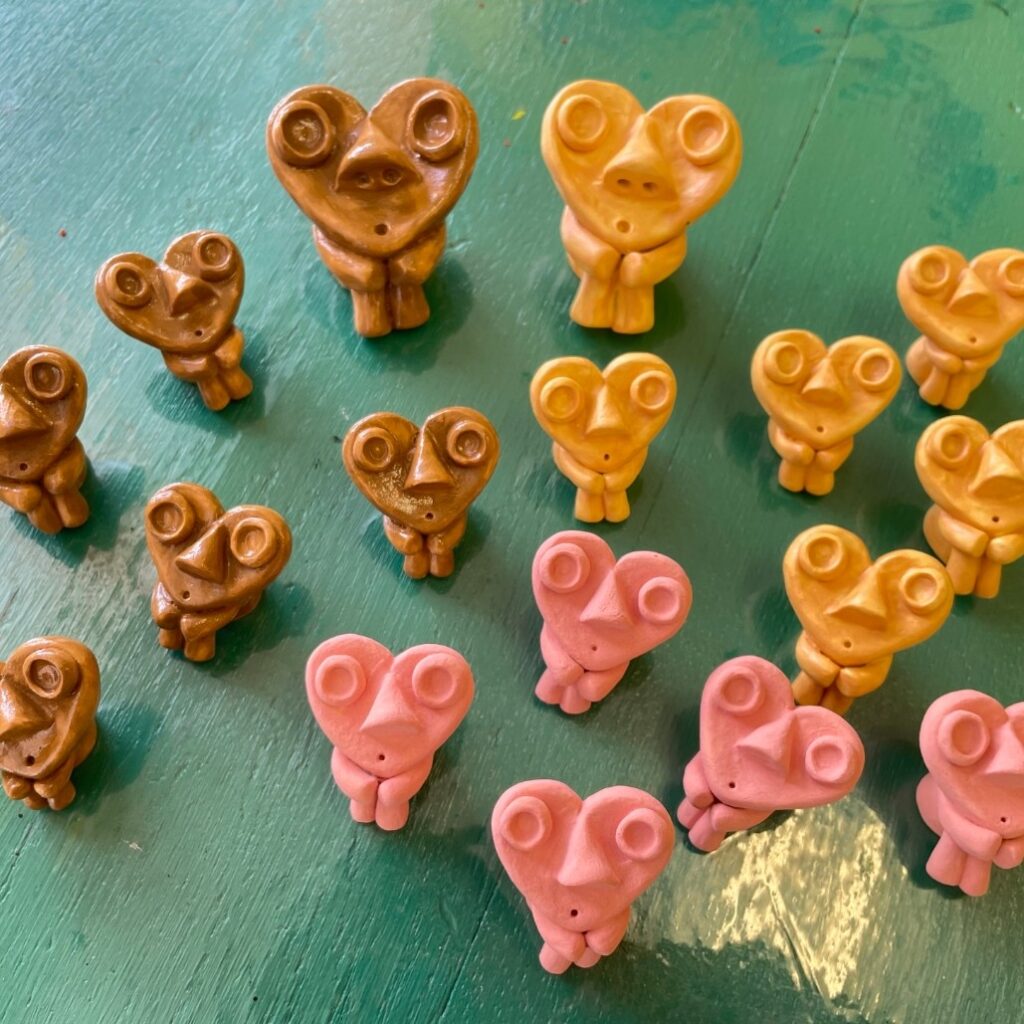 粘土をこねたり、絵を描いたり、ちくちく縫ったり、色んな表現ではにわ、古墳、土偶のかわいいもの作ってます。