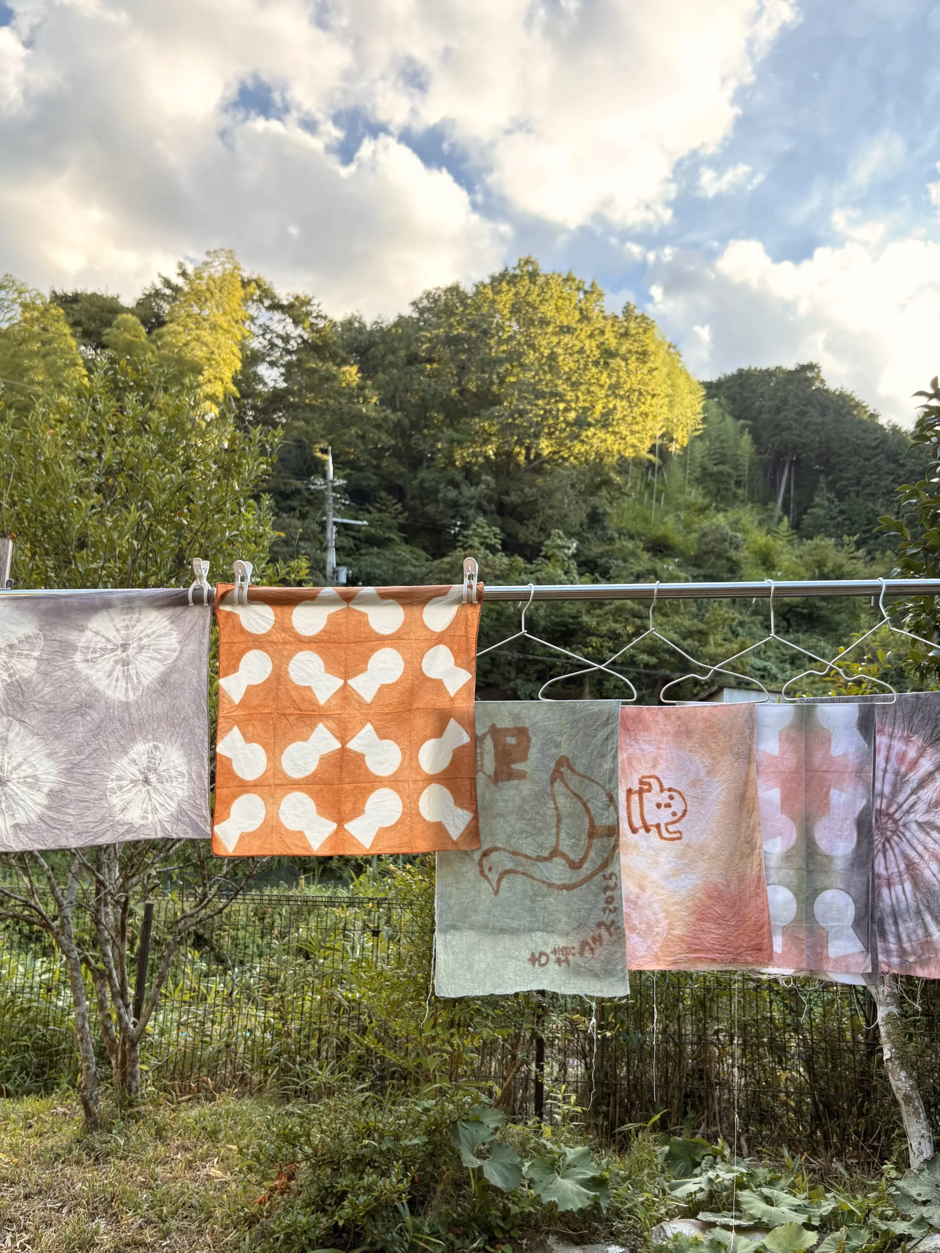 黄・赤・茶など様々なベンガラの色で、手ぬぐいなどを絞ったり、板で挟んだりして