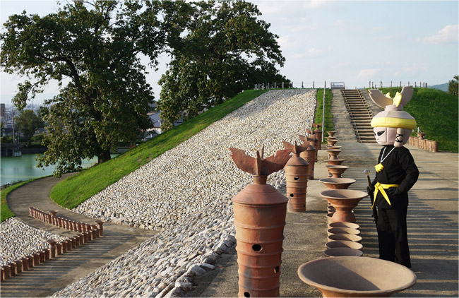 たるみ観光大使の「ごしきまろ」でしゅ!五色塚古墳は復元整備からちょうど50年が経ちました!