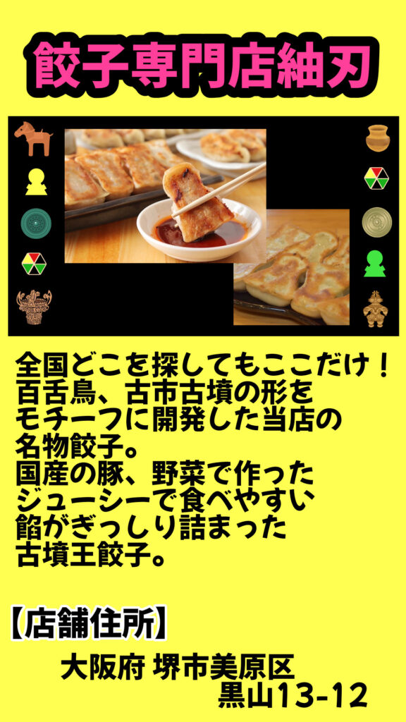古墳フード餃子専門店紬刃 2025年10月6日2025年10月6日 - by はにコット はにコット古墳フェスはにコットに関するページです。 毎年11月に今城塚古墳で古墳とアートのイベントを開催しています。 2024年vol.13 14回目の開催です。 来場者40,000人。(コロナ禍でもリモート開催で35,000人の来場者)