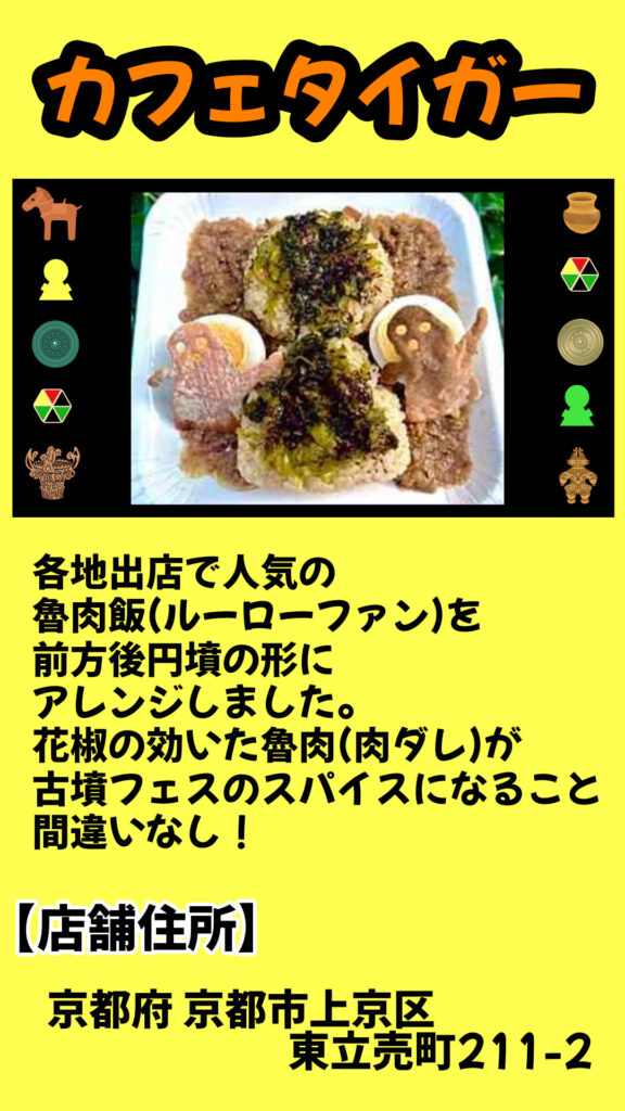古墳フードカフェタイガー 2025年10月6日 - by はにコット はにコット古墳フェスはにコットに関するページです。 毎年11月に今城塚古墳で古墳とアートのイベントを開催しています。 2024年vol.13 14回目の開催です。 来場者40,000人。(コロナ禍でもリモート開催で35,000人の来場者)