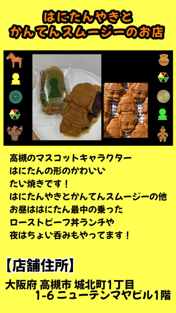 古墳フードはにたんやきとかんてんスムージーのお店 2025年10月6日 - by はにコット はにコット古墳フェスはにコットに関するページです。 毎年11月に今城塚古墳で古墳とアートのイベントを開催しています。 2024年vol.13 14回目の開催です。 来場者40,000人。(コロナ禍でもリモート開催で35,000人の来場者)