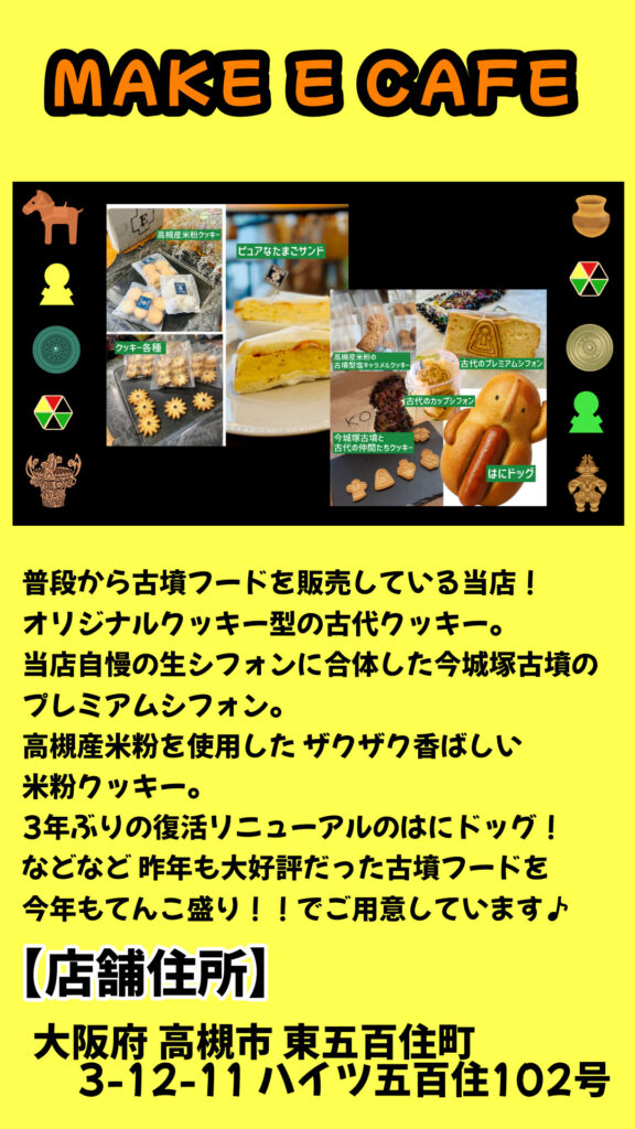 古墳フードMAKE E CAFE 2025年10月6日 - by はにコット はにコット古墳フェスはにコットに関するページです。 毎年11月に今城塚古墳で古墳とアートのイベントを開催しています。 2024年vol.13 14回目の開催です。 来場者40,000人。(コロナ禍でもリモート開催で35,000人の来場者)