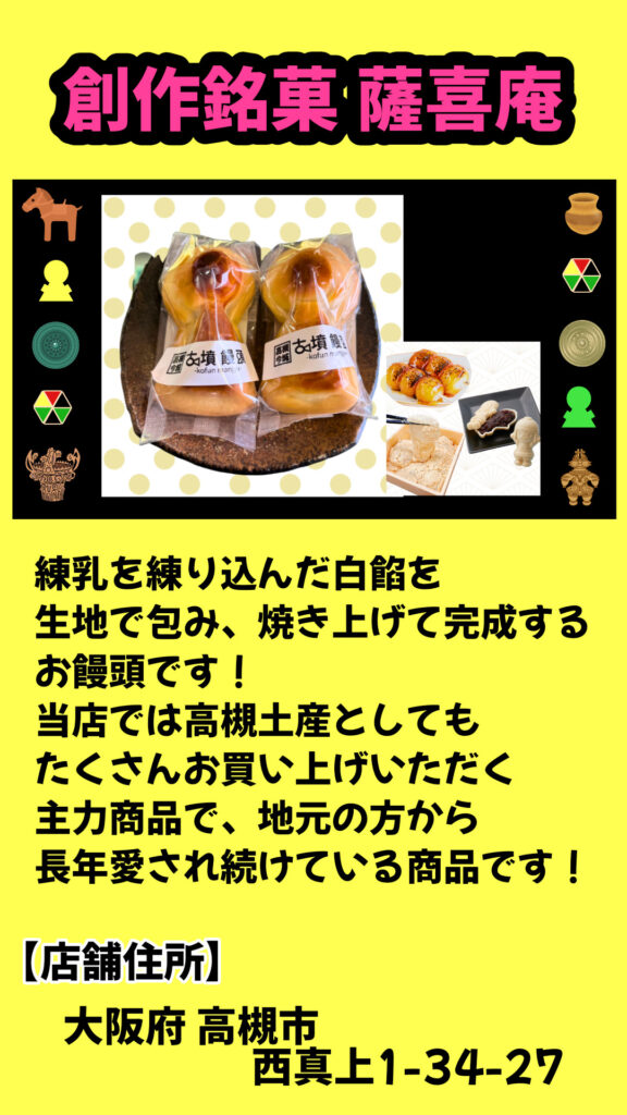古墳フード創作銘菓 薩喜庵 2025年10月6日 - by はにコット はにコット古墳フェスはにコットに関するページです。 毎年11月に今城塚古墳で古墳とアートのイベントを開催しています。 2024年vol.13 14回目の開催です。 来場者40,000人。(コロナ禍でもリモート開催で35,000人の来場者)
