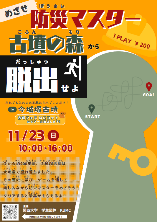 めざせ防災マスター 古墳の森から脱出せよ 関西大学 学生団体 KUMC presents 昨年も開催した古墳の中で行う企画です。 古墳の歴史と防災について、ゲームや体験を通して楽しみながら学べます。 参加賞として景品も用意しています。