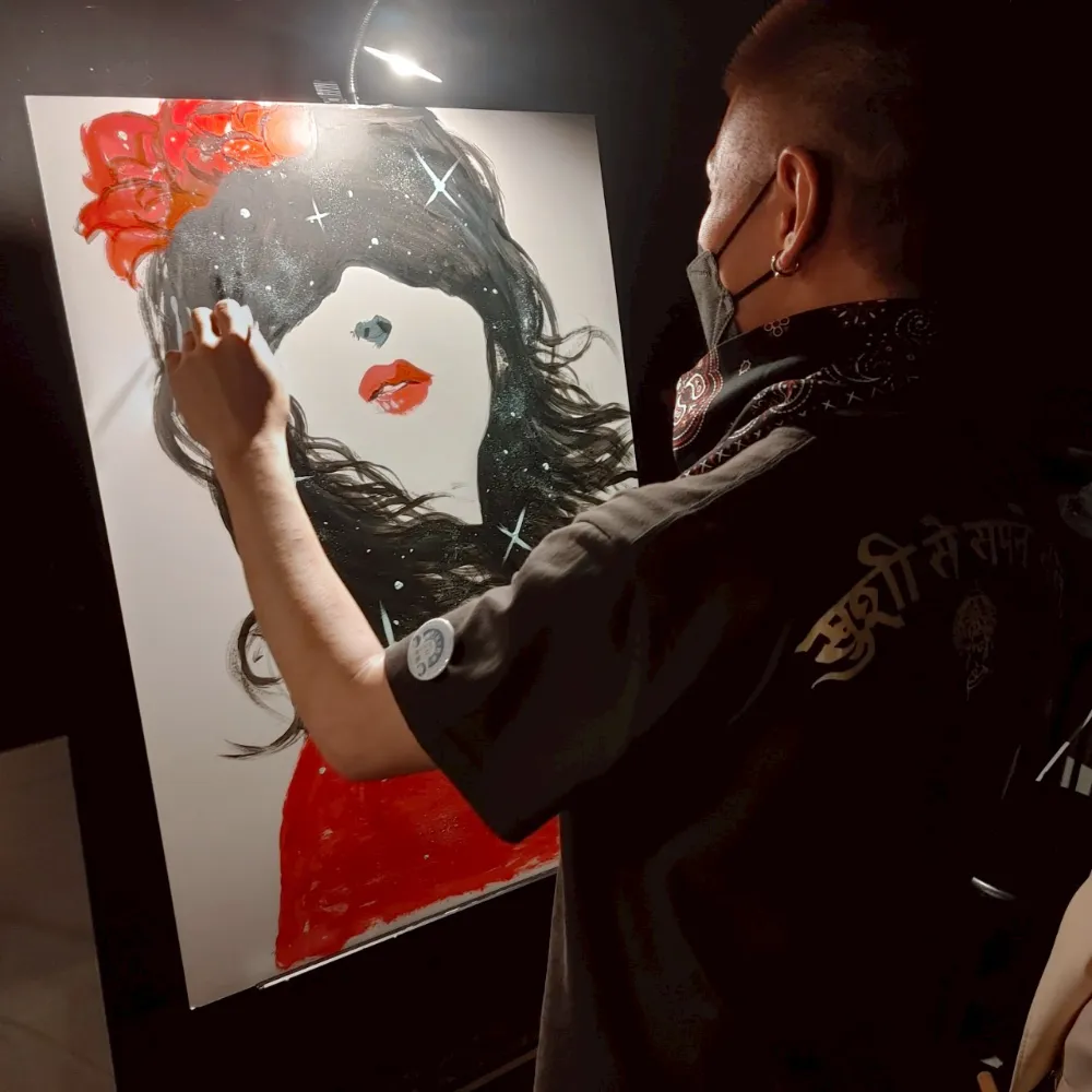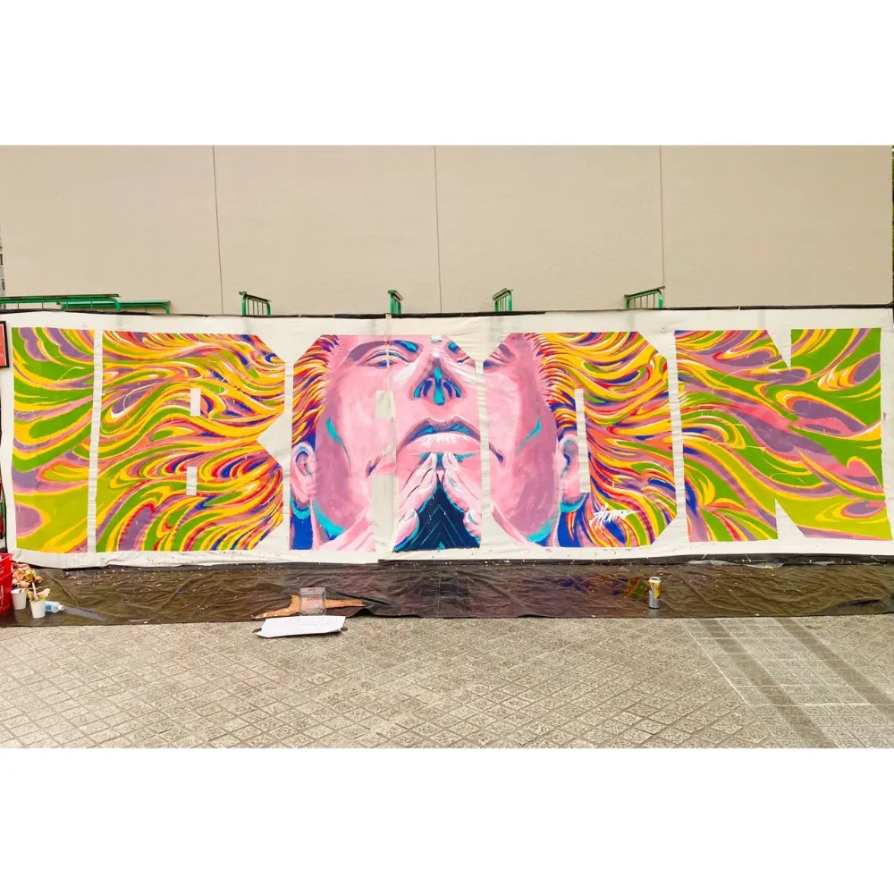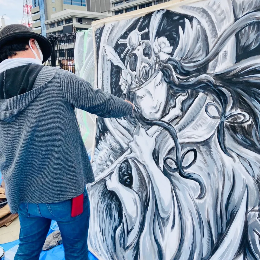 本業は男性ネイリストで指先という小さなキャンパスの表現からライブペイント時は数メートルという大きなキャンパスを自由に表現する。