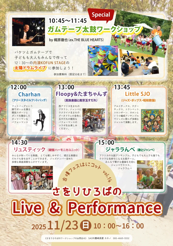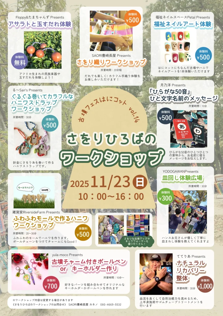さをりのひろばでは、ワークショップからライブ&パフォーマンスまで幅広く古墳はにわに関する企画をたくさん準備してお待ちしております!日頃体験できない企画がさをりひろばエリアだけで盛沢山!!!
